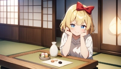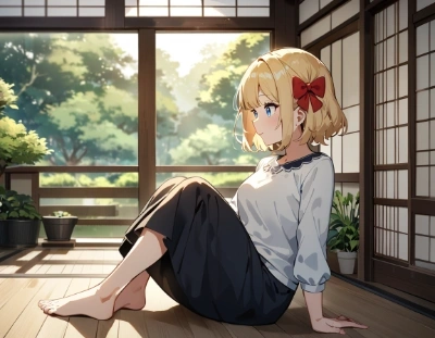 1girl,blonde hair,blue eyes,short hair,(hair bow:1.4),red bow,hair bow,red bow,solo,sitting on engawa,casual clothes,white blouse,skirt,barefoot,relaxed expression,daydreaming,peaceful,outdoor,traditional Japanese house,wooden floor,garden view,green plants,sunlight,serene atmosphere,gentle breeze,soft lighting,anime style,masterpiece,best quality,very aesthetic,absurdres:1.3,
