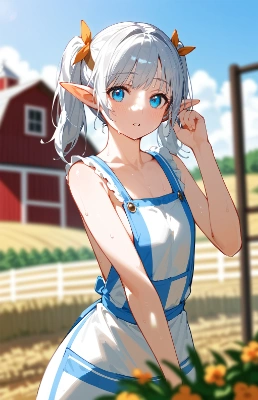 score_9,score_8_up,1girl,elf ears,solo,twintails,outdoors,silver hair,blurry background,blurry,parted lips,blue eyes,(farmer costume),basket,vegetables,work gloves,agitation,(hand on forehead:1.1),dynamic angle,depth of field,sweat,farm,