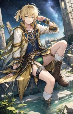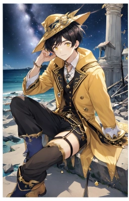 masterpiece, best quality, extremely detailed, anime, a cool boy, good-looking guy, handsome man, bobcut, garter belt, black hair, yellow eyes, dancer, wizard, fantasy, magic, starry sky, ruins, sea, panty shot, star gazing, sitting, happy,