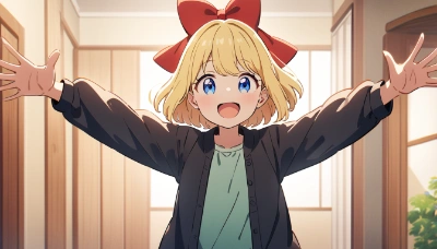1girl,solo,blonde hair,blue eyes,short hair,(hair bow,red bow:1.4),smug expression,proud expression,indoors,living room,casual clothes,white t-shirt,shorts,hands on hips,standing,cozy room,comfortable furniture,soft lighting,warm atmosphere,anime style,masterpiece,best quality,very aesthetic,absurdres:1.3,