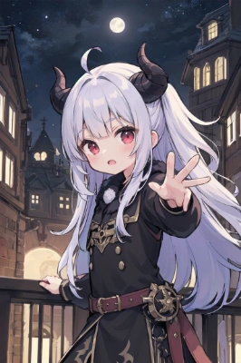 masterpiece, best quality, extremely detailed, anime, girl, skirt, determined face, a pretty woman, wet hair, silver hair, red eyes, demon, original character, perspective, steampunk, magic, night, full moon, moon, night sky, night view, starry sky, castle, different world, clear sky(The female Demon Lord turned towards me with a determined look on her face.),