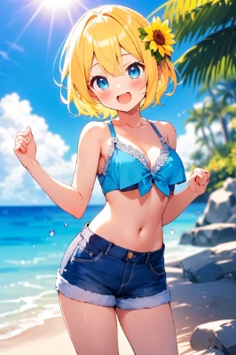 masterpiece, best quality, extremely detailed, illustration, anime screencap, (((cute, kawaii))), 1girl, yellow hair, short hair, spiky hair, blue eyes, blue bikini top, shorts, summer, sun flower