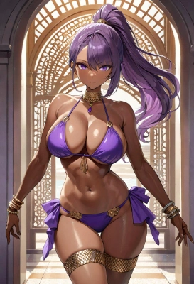 masterpiece, best quality, extremely detailed, anime , a pretty woman, ponytail, purple eyespure purple hair,sexy,brown skin,pool wear,no hand,glamorous, <lora:hairdetailer:0> <lora:saturation:1> <lora:sensualface_type2:1> <lora:eyecolle_clematis_v100:1> ,