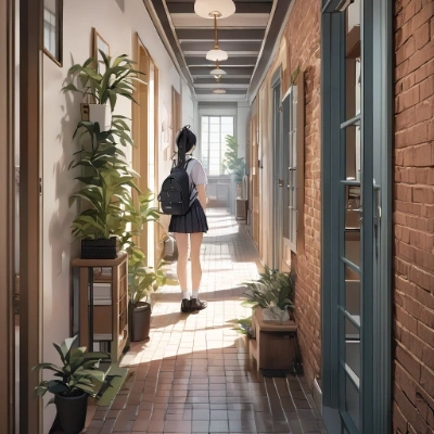 masterpiece,best quality,extremely detailed,1girl,ponytail,black hair,schoolgirl,Dark corridor,Red Emergency Lights,A corridor that extends to the back,{{houseplant}},{Place evenly spaced} <lora:hyperdetailer_v060.safetensors:1> <lora:noline:1>