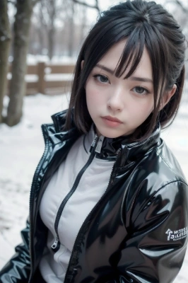 (photorealistic:1.4), (RAW photo), masterpiece, best quality, extremely detailed, lady, (enamel, latex, rubber:1.1), (shiny puffer jacket, tight down jacket:1.2), almond shaped eyes, cold gaze, staring, park, winter,