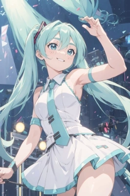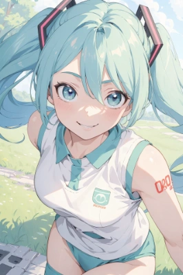 ((masterpiece)), ((high resolution)), ((best quality)), (ultra-detailed), anime, ((extremely detailed)), 4K, (8K), best quality, dynamic angle, (beautiful), solo, (hatsune miku), (yukata), smile, outdoors,