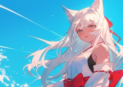 crayon drawing, silent happy, distorted space, come on, killer queen, beautiful cute dark-skinned girl, japanese miko clothes, silk texture, black undershirt, white hair, fox ears, thick eyebrows, sideway glance, imaginary lighting, colorful background, --ar 24:17 --niji 6