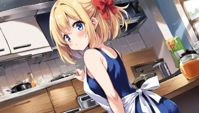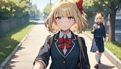 1girl,solo,short hair,blonde hair,blue eyes,red ribbon,(hair bow:1.4),red bow,hair ornament,(mole under eye:1.6),detailed background,anime style,japanese anime style,young girl,casual clothing,thoughtful expression,indoors,cozy room,soft lighting,vibrant colors,playful,charming,everyday life,warm tones,focused,curious,reflective,gentle shadows,personal moment,serene atmosphere,engaging,noticing,self-aware,expressive,delicate,youthful,introspective,
