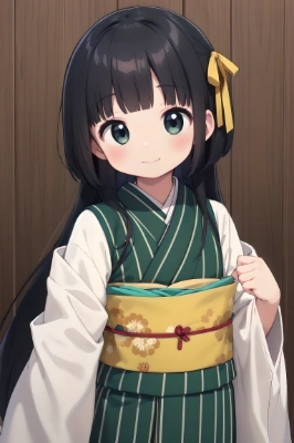 1 girl,(((very longest hair))),black hair, smile,straight Hair,hair ribbon,mintgreen stripe,Black Eyes,flat chest,straight Across bangs,princess Cut, Very Long Sideburn,roundry Head,Droping eyes,cute,Meekness,Bob Cut,long back hair,12 years Old, kimono,tear mole