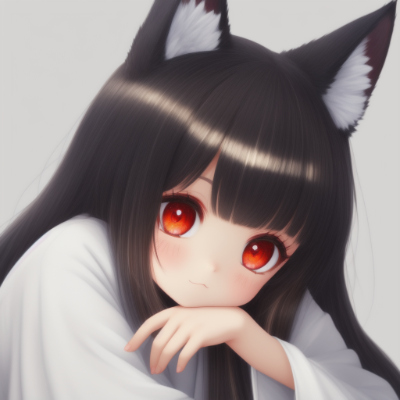 fox ear (little loli) miko, cute, beautiful, goddess, white kimono, black hair, red eyes, (many highlights:1.5) in eyes, (complex detailed:1.4) eyes, (thick eyelash), languorous, ennui, head_rest <lora:hairdetailer:0.7> <lora:bd_miko-000010:0.3>