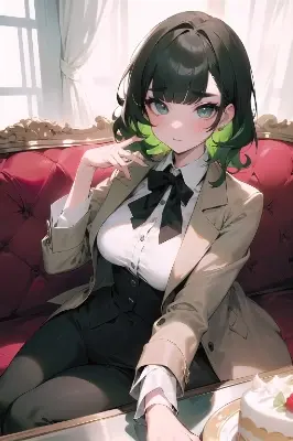(absurdres, highres, reflection, refraction, 8k: 1.4), BREAK (close up), 1girl is sitting on sofa, portrait, selfie, put on makeup, Foundation, Concealer, Powder, Blush, Highlighter, Eyeliner, Mascara, Eyeshadow, Eyebrow pencil, Lipstick, medium breasts, short green hair, wavy hair, flipped hair, blunt bangs, troubled eyebrows, blush, BREAK wearing white shirt, dress pants, blazer, cardigan for layering, accessorizing with jewelry, BREAK glamorous side of Paris with bold colors, luxurious textures, and elegant decor, sophistication, luxurious cake experience, cinematic lighting, overhead angle, stare at viewer