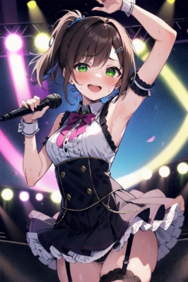 masterpiece, best quality, extremely detailed, anime, girl, skirt, a pretty woman, longhair, garter belt, silver hair, orange eyes, dancer, witch, elf, fantasy, magic, different world, sunset, ruins, forest, blushing, panty shot, smiling,