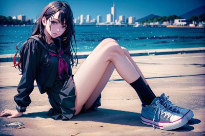 (8K, high resolution, masterpiece, awesome photo-reality illustration:1.6), Here is a high-quality, extremely realistic image prompt based on your input:A masterpiece of Japanese beautiful teenage is sitting alone in floor of Futuristic room . A stunning 17-year-old girl with black short hair featuring straight bangs framing her face, covering her left eye. Her very thin eyes are half closed, exuding disdain as she gazes downward. She wears a traditional black sailor school uniform with a black pleated mini skirt and white ankle socks paired with Converse low-cut sneakers. Her both hands rests on her flat chest. The scene is captured from the behind, showcasing the girl's full body in an unmoving pattern. The atmosphere is dark and moody<lora:EMS-97323-EMS:0.800000>