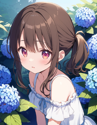 (blue hydrangea, cinematic portrait:1.2), brown hair, white dress, bare shoulder, (missing mood, pastel tone, light-blue tone:0.8), love,
