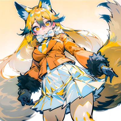 1girl, ezo_red_fox(kemono_friends), animal ears, fox ears, extra ears, fox tail, long hair, hair between eyes, multicolored hair, blonde hair, white hair, gradient hair, yellow eyes, large breasts,