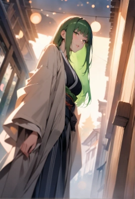 absurdres,very aesthetic,masterpiece,best quality,hires,2d,pastel_color,(watercolor_painting:1.2),(beautiful eyes and pupils:0.8),ephemeral,delicate BREAK official art,summer,mature_female,green hair,ponytail,asymmetric bangs,Neat and clean,sleeveless,casual,portrait,light particles,hydrangea,refreshing,<lora:Fixhands_anime_bdsqlsz_V1:0.6>,