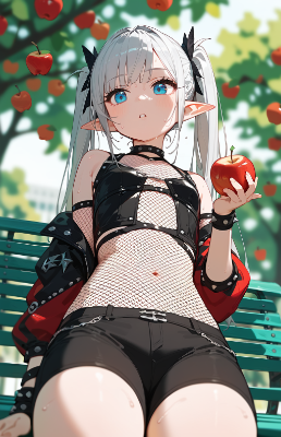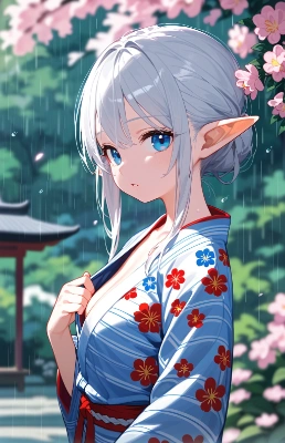 score_9,score_8_up,1girl,elf ears,solo,outdoors,silver hair,sidelocks tied back,blurry background,blurry,parted lips,blue eyes,looking at viewer,(red color Yukata),(morning glory pattern),(flower in mouths:1.1),depth of field,rainy,Japanese gardens,gravel,,