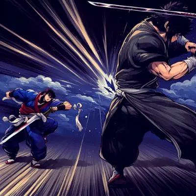 太陽が沈み、長い影を落とす戦場では、2人の猛者が激しい戦いを繰り広げていた。二人の剣がぶつかり合い、その激しさを物語り、見物人は息を呑んで勝敗を予想する。