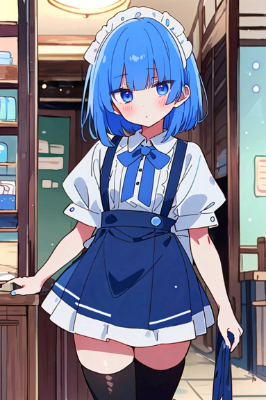 masterpiece, best quality, extremely detailed, anime, , , hair, eyes,fantasy,colorful,bobcut,zettai ryouiki, ,girl, ,ojou-sama,waitress,blue hair,blue eyes ,garter belt,mini ,mini ,skirt,mini skirt <lora:hime_style-1.0r8:-1>
