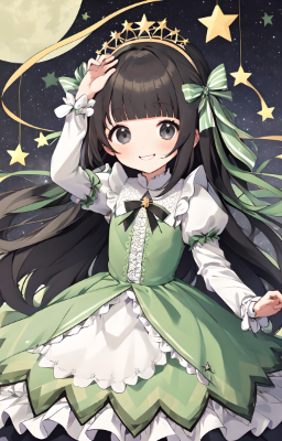 1 girl,(((very longest hair))),black hair, smile,straight Hair,hair ribbon,mintgreen stripe,Black Eyes,flat chest,straight Across bangs,princess Cut, Very Long Sideburn,roundry Head,Droping eyes,cute,Meekness,Bob Cut,long back hair,12 years Old, kimono,star