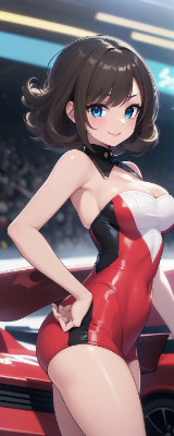 (8K, best quality, master piece: 1.2), super high resolution,1girl,((shiny skin)),ultra-detailed face,smile,detailed eyes,blue and white race queen costume,show model,brown hair,curly hair,the girl standing beside a racing car ,,, <lora:flat2:1> <lora:hairdetailer:1> ,