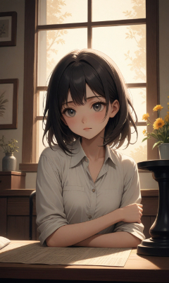 (((Masterpiece, High Quality, 8k, Best Quality, high resolution,line anime style, 1 girl))),((pouty face)),dark purple hair,yellowish leaf color eyes,bossabosa hair,duck mouth,coldest fired tapestry