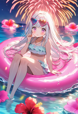 masterpiece, best quality, extremely detailed, anime, girl, <lora:flat2:0> <lora:hairdetailer:1> longhair, white hair inpink hair, pink eyes, colorful, summer, sea,sitting on a pink glitter float,Shiny,cute,white bikini,nail art,necklace,With bangs,petals on the water surface,straight hair,Lip,long eyelash,fireworks in the sky,water gun,