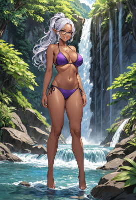 masterpiece, best quality, extremely detailed, anime, 1 adult woman, solo, a pretty woman, ponytail, silver hair, wavy hair, yellow eyes, elf, dark skin, large breast, glasses, smile, fullbody, standing, violet eyepatch bikini,, waterfall, ,
