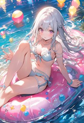masterpiece, best quality, extremely detailed, anime, girl, <lora:flat2:0> <lora:hairdetailer:1> , girl, longhair, white hair inpink hair,Shiny pink eyes, colorful, summer, sea,sitting on a float,Shiny,cute,bikini(white),water surface,nail art,necklace,With bangs,Lip make,Navel exposed,Sparkling water surface,many fireworks in the sky(vivid),swimsuit(sexy)fireworks in the sky,float ring(pink Glitter),