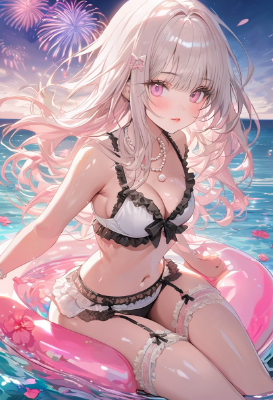 masterpiece, best quality, extremely detailed, anime, girl, <lora:flat2:0> <lora:hairdetailer:1> , girl, longhair, white hair inpink hair,pink eyes, colorful, summer, sea,sitting on a float,Shiny,cute,bikini(white),water surface,nail art,necklace,With bangs,Lip make,Navel exposed,Sparkling water surface,many fireworks in the sky(vivid),swimsuit(sexy)fireworks in the sky,float ring(pink Glitter),PEARL garter belt,vivid color fireworks in the sky,