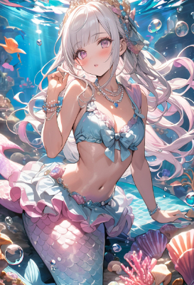masterpiece, best quality, extremely detailed, anime <lora:flat2:0> <lora:hairdetailer:1> girl, longhair, white hair in pink hair, pink eyes, colorful, fantasy,seashell bed,shell,Shiny rainbow bubble,bubbles glow underwater,bikini,swimsuit(sexy)PEARL,accessory,nailart,With bangs,long eyelash,lip make,necklace,sit on a bed of seashells,shining underwater,