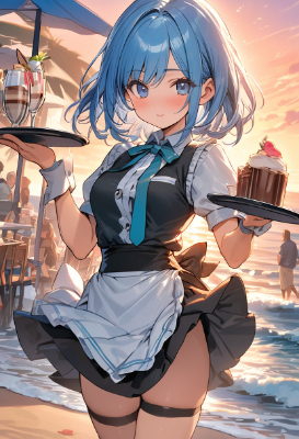 masterpiece, best quality, extremely detailed, anime, , , hair, eyes,bobcut,zettai ryouiki, , ,waitress,blue hair,blue eyes ,mini ,mini ,skirt, , , ,side,beach <lora:hime_style-1.0r8:1>,princess,ry , ,sunset,a pretty woman