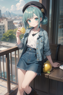 holding up lemon side, masterpiece, best quality, highres, 1otoko no ko, (navy blue blazer:1.3), yellow cardigan, (brown pleated skirt:1.3), navy blue knee-high socks, loafers, school bag, かわいい, flat chest, aqua hair, aqua eyes, half updo, smile, 16 yo, nice hands, perfect hands<lora:flat2:0> <lora:hairdetailer:0.5><lora:GoodHands-vanilla:1>