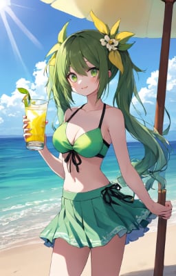 masterpiece, best quality, extremely detailed, anime, girl, skirt ,mini skirt,blue hair,green hair,twintail,longhair,lemon,fantasy,sea,blue sky,clear sky,beach,lemonade,beachparasol bikini swimwear 1girl, hatsune miku, vocaloid, masterpiece, best quality, rating: general, newest ,green eyes