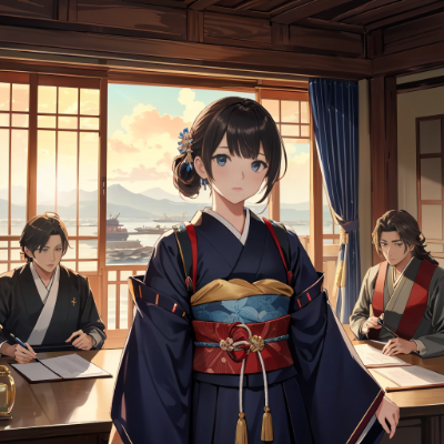 (cinematic light),hyper detail, dramatic light,high resolution,best quality, masterpiece, 8k, female, solo,Based on the Treaty of Friendship and Commerce concluded by the Edo shogunate with five countries (the United States, the United Kingdom, France, the Netherlands, and Russia), three ports (Yokohama, Nagasaki, and Hakodate (Hakodate)) were opened and a proclamation was issued allowing free trade.