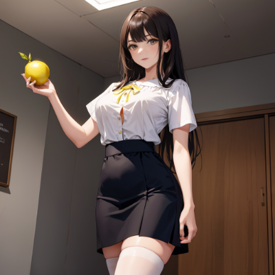 ((cinematic light)), hyper detail, dramatic light,high resolution,School Entrance,best quality, masterpiece, 1 female, white skin,brown eyes,detailed face,beautiful female,(black long hair),schoolteacher,flat chest,23 years old,cowboy shot,breast focus,holding hands,(white short sleeves business blouse:1.2),black stockings, black pencil skirt,(She holds a lemon in her right hand:1.3)