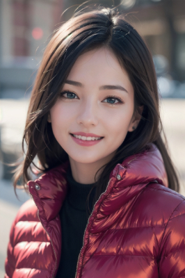 (photorealistic:1.4), (RAW photo), masterpiece, best quality, extremely detailed, lady, (shiny, tight:1.2), puffer jacket, puffer coat, down jacket, down coat, (closed zipper:1.1), micro mini skirt, knee high boots, seems kind, smile, drooping eyes, long hair, cold, winter, ,