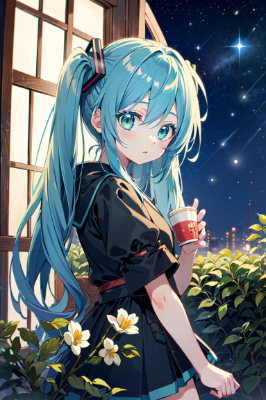 masterpiece, best quality, extremely detailed, anime, girl, skirt,1girl, hatsune miku, vocaloid, masterpiece, best quality, rating: general, newest,mini skirt,twintail,longhair,blue hair,green hair,tea,green eyes,Japanese style,watercolor,teahouse,flower,night,starry sky,Tanabata