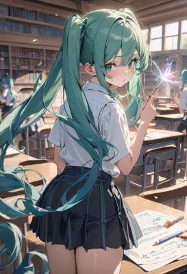 masterpiece, best quality, extremely detailed, anime, , skirt1, hatsune miku, vocaloid, masterpiece, best quality, rating: general, newest,mini skirt,twintail,longhair,girl,blue hair,green hair,green eyes,pencil,heart,school,schoolgirl,idol,classroom, at ,library,magic,fantasy