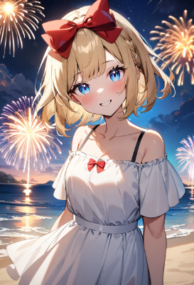 1girl,loli,anime style,young girl,blonde hair,short haircut,blue eyes,waving hello,smiling expression,red hair bow,casual dress,friendly gesture,outdoor setting,morning light,no realism,masterpiece,best quality,very aesthetic,absurdres,greeting:1.3,friendliness:1.2,