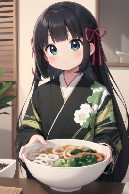 1 girl,(((very longest hair))),black hair, smile,straight Hair,hair ribbon,mintgreen stripe,Black Eyes,flat chest,straight Across bangs,princess Cut, Very Long Sideburn,roundry Head,Droping eyes,cute,Meekness,Bob Cut,long back hair,12 years Old, kimono,heart