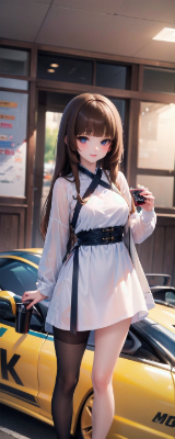 (8K, best quality, master piece: 1.2), super high resolution,1girl,((shiny skin)),ultra-detailed face,smile,detailed eyes,blue and white race queen costume,show model,brown hair,curly hair,the girl standing beside a racing car ,, , <lora:sanDka2:1> <lora:hime_style-1.0r8:1> ,