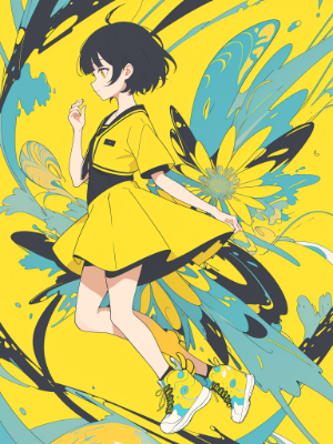 (bright yellow background:1.3), (extremely detailed fine touch:1.3), (2D:1.3), ///, kawaii girl, black short hair, abstract, colorful anime-style illustration, school uniform, composed of dynamic, swirling patterns, vibrant circles, bright yellow background, multi-colored design, with the intricate, striking contrast, <lora:flat2:1>