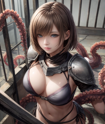 final fantasy xi,cinematic light, colorful, hyper detail, dramatic light,high resolution,best quality, masterpiece, best quality, ultra-detailed, illustration,tentacle,(Jail:1.5),1female, solo,Beautiful Eastern European female,extremely delicate and beautiful girls,intrepid face,(small eyes:1.2),25 years old,hdr,BREAK,(realistic:1.0),grey eyes,large breast,brown hair,short hair,swept bangs,adventure hunter,armor, bikini armour, gauntlets, boots,plating, protection, defense, offense, BREAK,dynamic angle, be captured,(octopus:1.2),person with arms entangled in an octopus,<lora:add_detail:1>