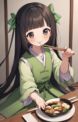 1 girl,(((very longest hair))),black hair, smile,straight Hair,hair ribbon,mintgreen stripe,Black Eyes,flat chest,straight Across bangs,princess Cut, Very Long Sideburn,roundry Head,Droping eyes,cute,Meekness,Bob Cut,long back hair,12 years Old, kimono,Udon,rice bowl
