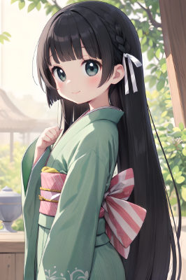 1 girl,(((very longest hair))),smile, Black hair,straight Hair,hair ribbon,mintgreen stripe,Black Eyes,flat chest,straight Across bangs,princess Cut, Very Long Sideburn,roundry Head,Droping eyes,cute,Meekness,Bob Cut,long back hair,12 years Old,loli,Udon,eating,chopstick