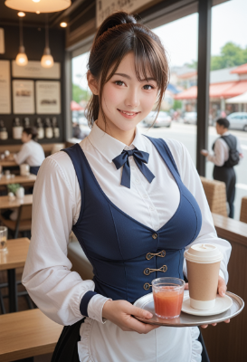 masterpiece, best quality, highres, extremely detailed, sexy adult woman, straight hair, light brown hair, forehead, tareme, breasts, plump, shoulder strap, (denim:1.1) shirt, tight clothes, (cleavage:0.9), denim shorts, thighs, thigh strap, choker, lips, (mole under eye:0.9), smile, arms behind back, arched back, indoors, tavern