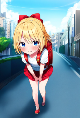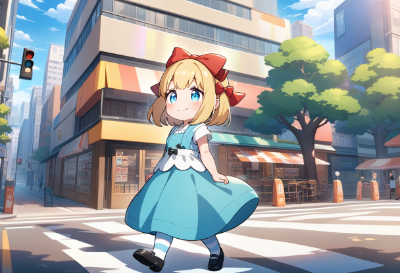 1girl, solo, blonde hair, short hair, blue eyes, (hair bow:1.3), red bow, (anime style:1.2), young, petite, Alice in Wonderland costume, blue dress, white apron, striped stockings, black mary jane shoes, standing on giant palm, surreal, fantasy setting, (wonderland:1.2), small size, curious expression, looking up, giant hand, detailed skin texture, floating objects, playing cards, teacups, pocket watch, mushrooms, cheshire cat smile, swirling background, magical atmosphere, (masterpiece:1.3), (best quality:1.3), (very aesthetic:1.2), absurdres, best quality, amazing quality, very aesthetic, absurdres