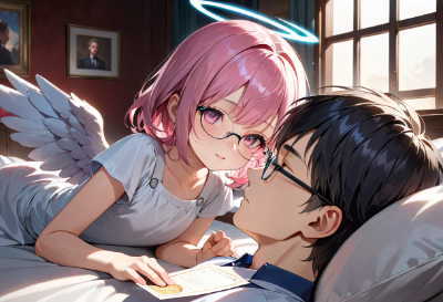 masterpiece, best quality, extremely detailed, absurdres, highres, ultra detailed, an angle girl and a boy, (glasses girl:1.3), (floating girl), 8yo, pink hair and pink eyes, pure white angel costume, handing an envelope of ticket to a boy, BREAK, the boy lying on bed with sick, brown hair and brown eyes, Divine atmosphere, photorealistic ,