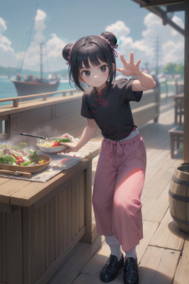 masterpiece, best quality, extremely detailed, anime, a girl, child, lolita, black hair, short hair, 2bun hair, black eyes, narrow eyes, sulking, closed mouth, cool, kung fu, (completely pink kung fu clothes), (completely pink kung fu pants), black loafers shoes, (Kung Fu pose), (holding a chinese cooking knife), (standing on the ship deck), salad on the table, (a barrel filled with lots of vegetables), blue sky, sea, medieval sailing ship, middle ages, age of discovery<lora:hairdetailer:1> <lora:yawanuri:1> ,